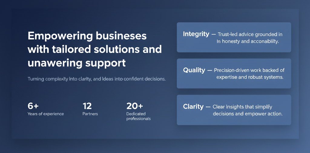 Our mission is simple: to remove the operational burden that holds businesses back, and replace it with clarity, confidence, and control. When compliance runs smoothly and accuracy is assured, you gain the freedom to focus on growth, strategy, and what truly moves your business forward.